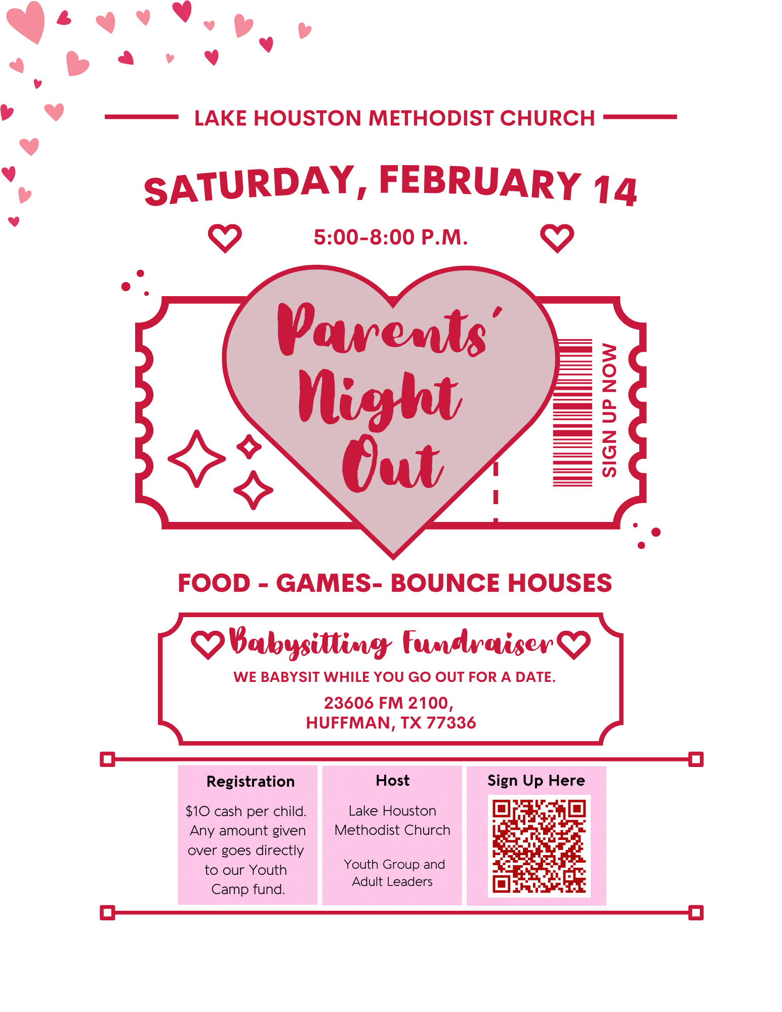 Take a night off and let us take care of the kids! Join us for Valentine’s Parents’ Night Out on Friday, February 14, from 5–8 PM. Kids will enjoy a fun, safe evening while parents enjoy a well-deserved break.